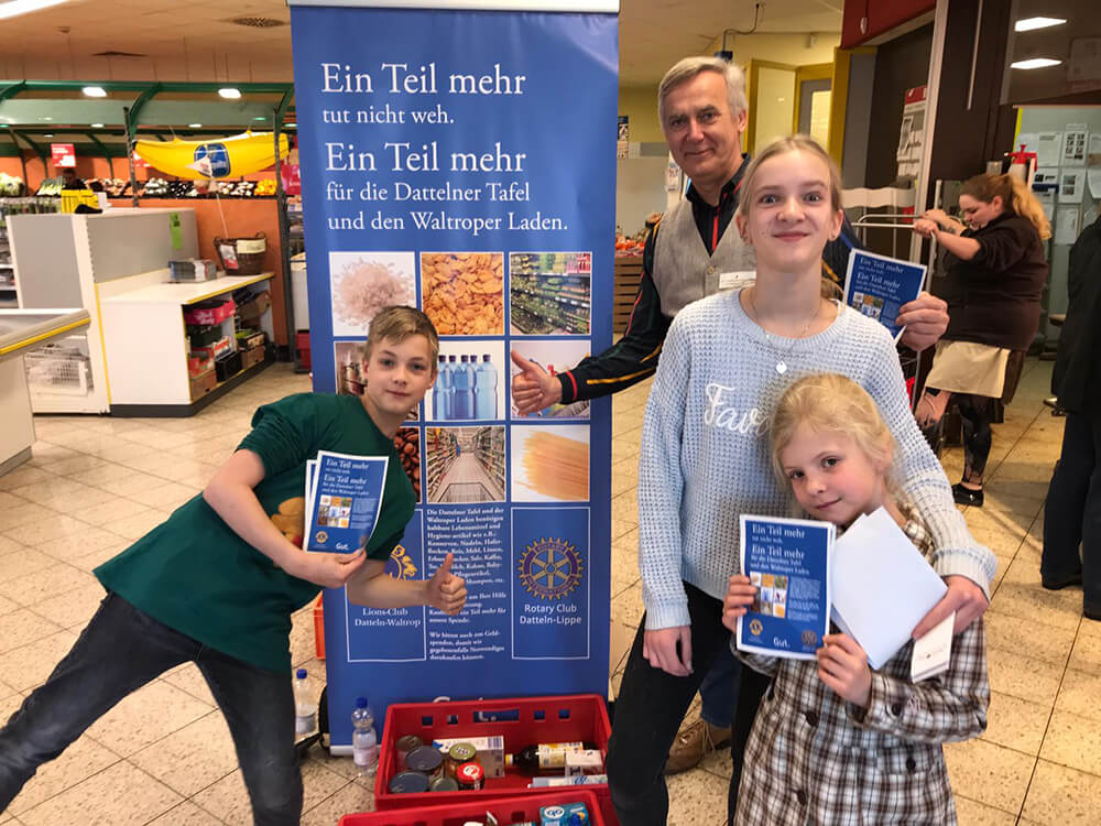 Mitarbeiter der Caritas Datteln-Waltrop sowie Mitglieder des Rotary Clubs RC Datteln-Lippe und des Lions Club Datteln-Waltrop sammelten an verschiedenen Standorten in Datteln und Waltrop Ein Teil mehr für die Dattelner Tafel und den Waltroper Laden. Es konnten über 100 Kisten mit Lebensmitteln und Produkten für das tägliche Leben gefüllt werden.